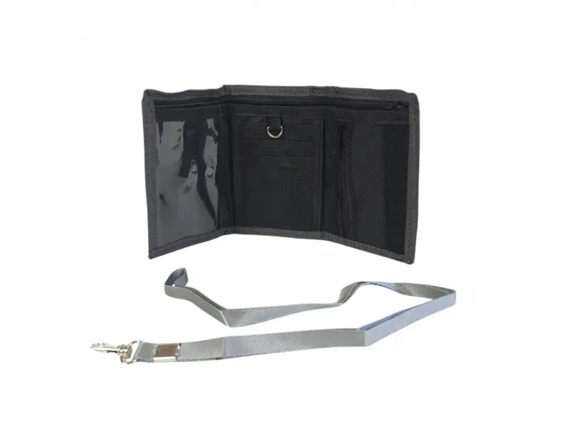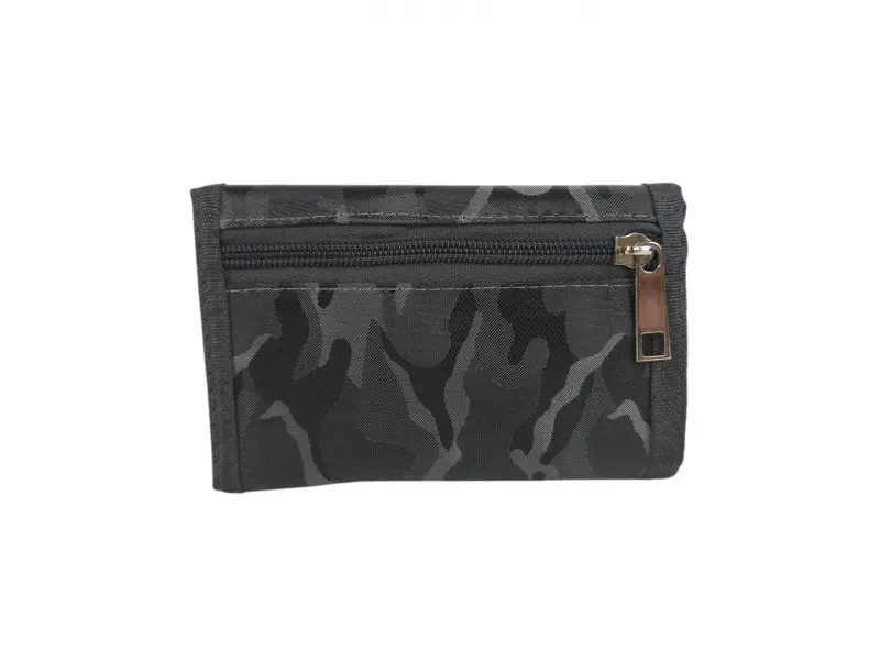 Камуфлажен черен портфейл - Мъжки портфейл от плат. - Отделенение за банкноти. - Отделение с цип. - Слотове за карти и лични документи. - Монетник с цип. - Връзка за носене.