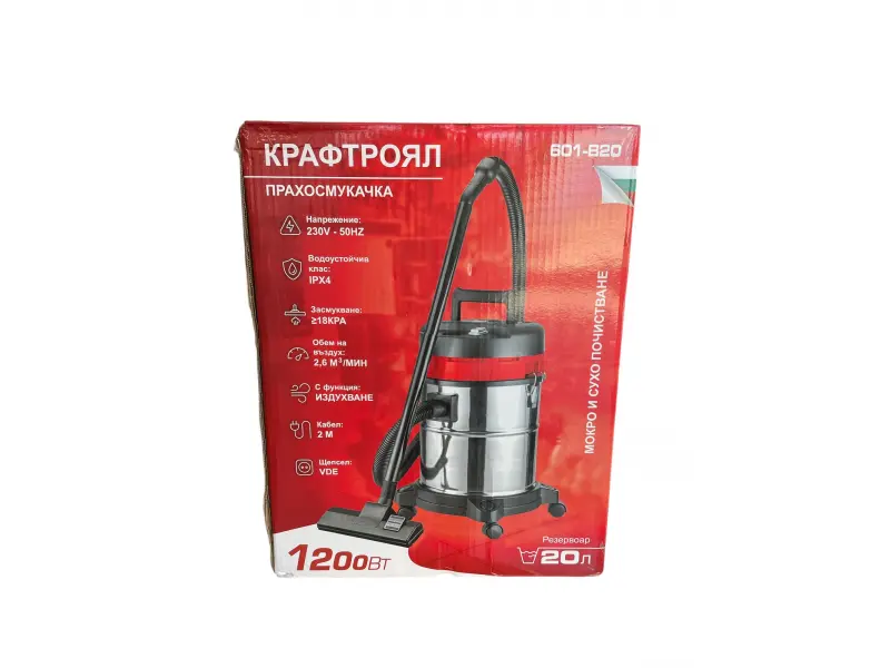 Прахосмукачка KraftRoyal 601-B20 – Мощност и Многофункционалност 💪🧹 Идеална за Всеки Дом 🏠 Прахосмукачката KraftRoyal 601-B20 е проектирана да отговори на всички ваши нужди за почистване. С мощност от 1200 W и високо ниво на засмукване ≥18 KPA, тя е идеална за сухо и мокро почистване в дома, гаража или градината. Практичност и Удобство 🧼 С 20-литров резервоар от неръждаема стомана, KraftRoyal 601-B20 осигурява дълготрайна работа без често изпразване. Тя е способна да премахва както едри строителни отпадъци, така и вода, което я прави изключително многофункционална. Лесно Почистване без Торба Висококачественият платнен филтър позволява работа без торба, а удълженият маркуч и комплектът дюзи осигуряват достъп до труднодостъпни места. С четирите въртящи се колела, маневреността е лесна и удобна. Характеристики на Продукта 📋 Характеристика Стойност Напрежение 230V / 50Hz Мощност 1200W Водоустойчив клас IPX4 Засмукване ≥18 KPA Обем на въздуха 2.6 м³/мин Резервоар 20 литра (неръждаема стомана) Филтър текстилен (мембранен), за работа без торба Дължина на кабела 2 м Щепсел VDE С функция за издухване Да Комплект дюзи и маркуч Да Колела 4 въртящи се за лесно движение Подходяща за сухо и мокро почистване
