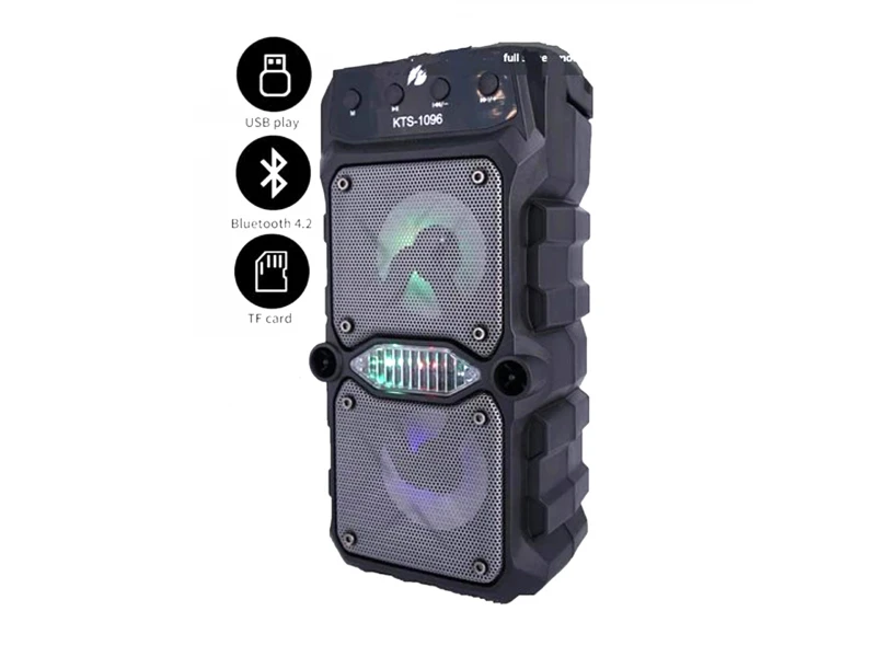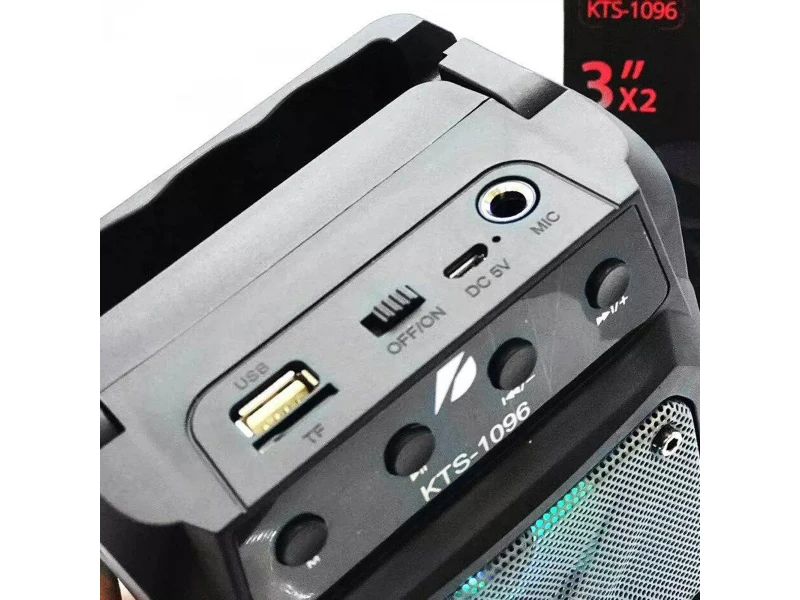 Караоке тонколона KTS 1096 с FM тунер, дистанционно, BLUETOOTH функция, микрофон, цветомузика.Тонколоната е подходяща за партита, празненства, презентации и др. Изключително удобна е за използване на места, където няма електричество.Характеристики:2бр. говорители: 3nch;Захранване: 220V;Светлинни ефекти;Bluetooth;Радио;Слот за SD/MMC/MMS карта памет;Слот за USB флашка;Панел за управление;Дистанционно управление;Вградена акумулаторна батерия: 3.7V/2400mAhКомплекът съдържа:1бр. караоке тонколона;1бр. микрофон с кабел;1бр. дистанционно управление;1бр. кабел за зареждане на тонколоната 220V.