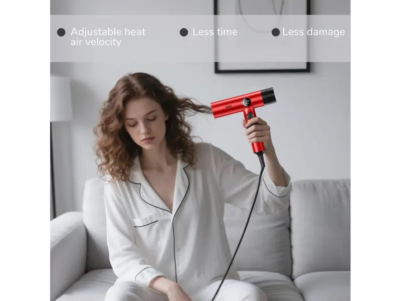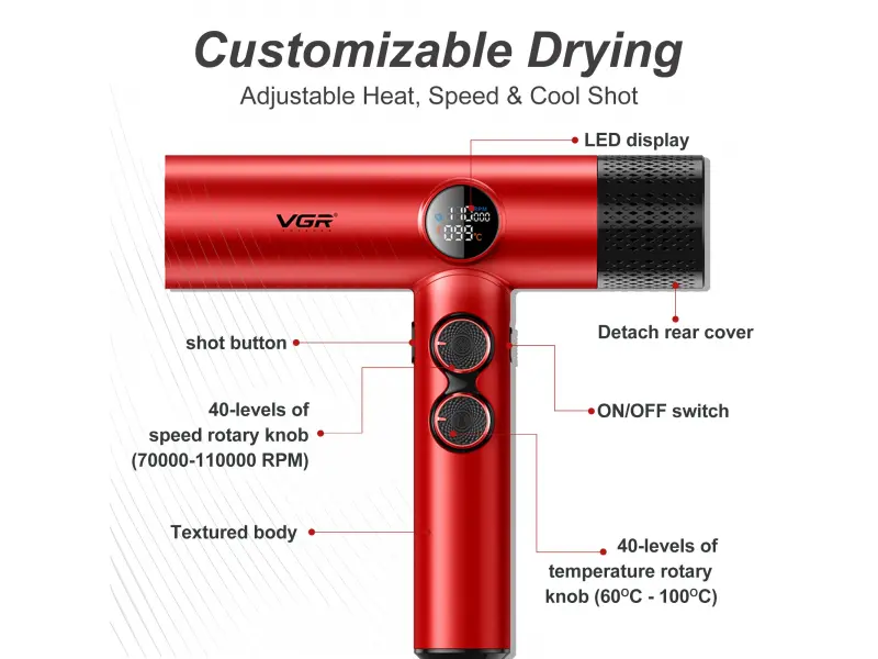 Професионален сешоар VGR-401 в червено с BLDC мотор и отрицателни йони – за бързо, щадящо и тихо сушене на косата. LED дисплей за лесен контрол, антистатичен ефект и естествен блясък. Изберете качество и комфорт за вашата ежедневна грижа!