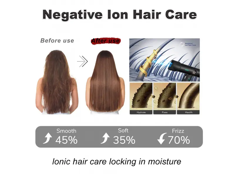 Благодарение на усъвършенстваната система с отрицателни йони, ще се радвате на гладка, мека и жизнена коса без статично електричество и къдрене. Вашата прическа ще изглежда естествено лъскава и здрава всеки ден!