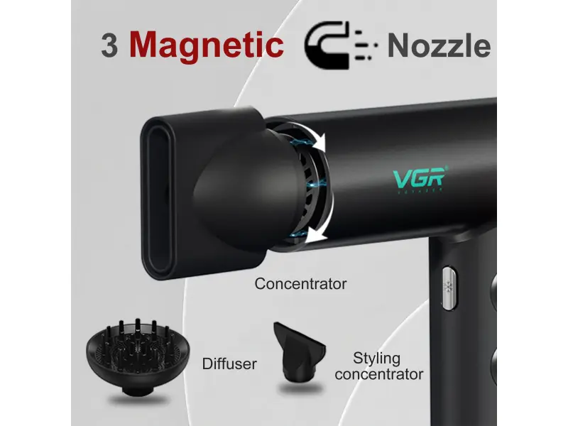 Компактният и лек дизайн с 360° въртящи се магнитни дюзи и дифузер осигурява лесна смяна на приставките и удобство при пътуване. Това го превръща в перфектния избор както за домашна употреба, така и за професионалисти в движение.