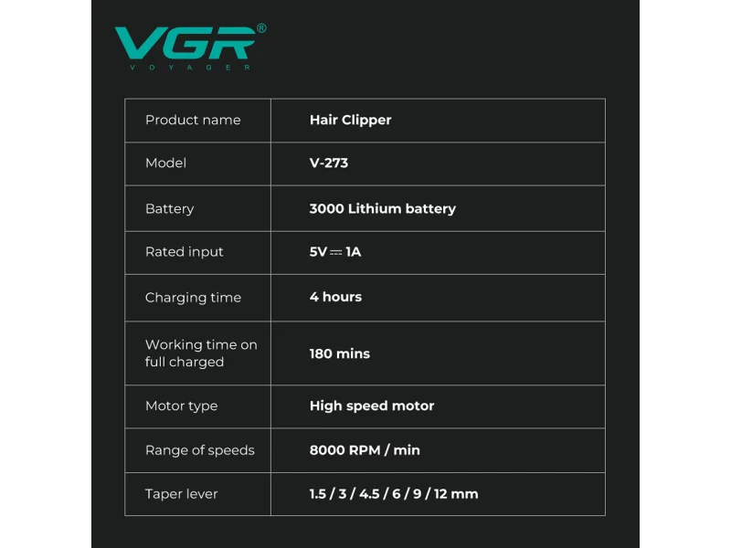 Машинката VGR V-273 е изработена за мъже, които не правят компромис с качеството. Комбинира здрава конструкция, модерни технологии и висока производителност. Подходяща за професионални фризьори, барбери и домашна употреба - тя е повече от просто подстригване.