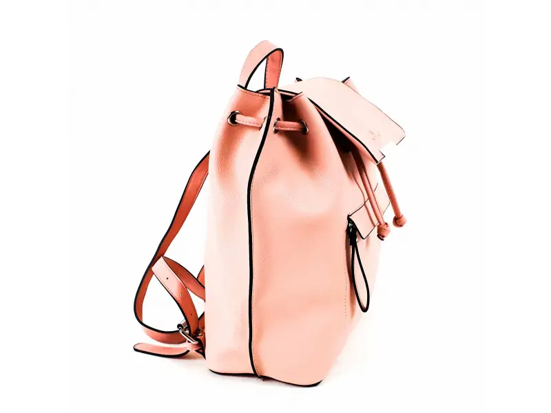 Модерна дамска раница от изкуствена кожа. Розова дамска раница с едно основно отделение, затварящо се с магнитно закопчаване и пристягане с кожени връзки. Раница с малко вътрешно джобче с цип, преден джоб с цип, дръжка за носене и регулиращи се презрамки.