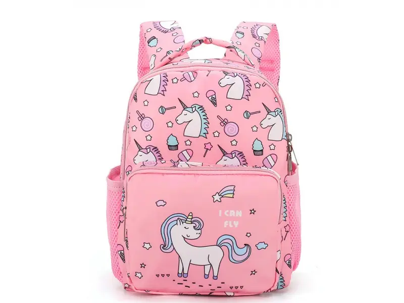 Интересна детска раница в розов цвят - еднорог. Раница с едно голямо отделение с цип, вътрешно джобче с мрежа, преден джоб с цип и две отделения за бутилки. Раница с удобни регулиращи се презрамки.