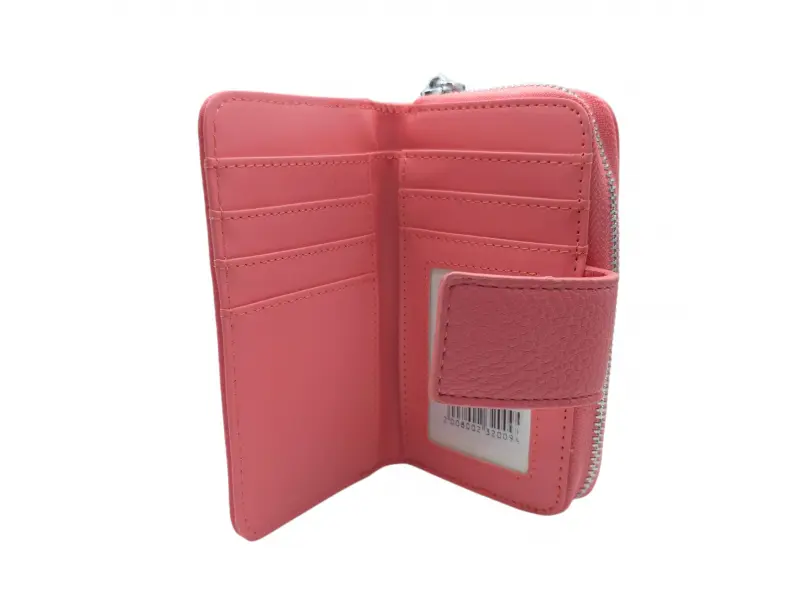 Розово дамско портмоне с интересен дизайн от качествена изкуствена кожа. Практично дамско портмоне с удобни отделения за банкноти, карти и монети. Малко дамско портмоне с тик-так закопчаване.