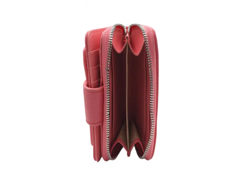 Практично дамско портмоне - Дамско портмоне от еко кожа. - Закопчаване с копче тик-так. - Отделения за карти и лични документи. - Отделение за банкноти. - Джоб за монети с цип.
