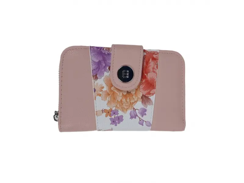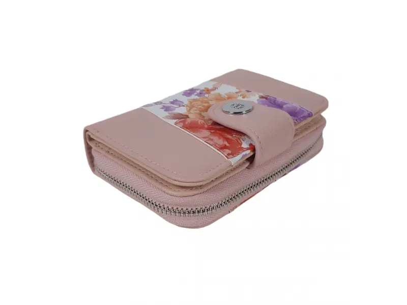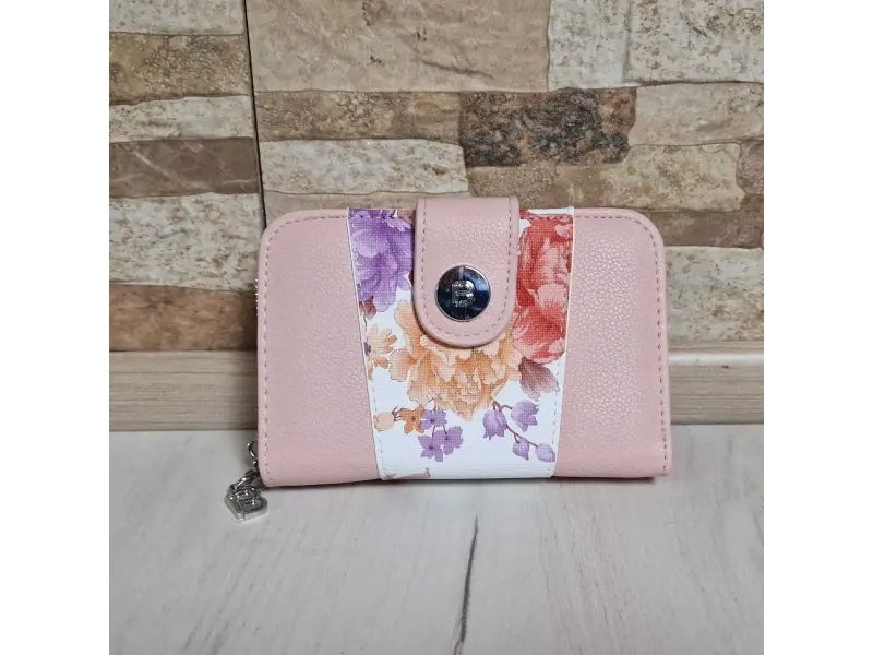 Стилно дамско портмоне в розов цвят - Дамско портмоне от еко кожа. - Закопчаване с копче тип магнит. - Отделения за карти и документи. - Отделение за банкноти. - Отделение за монети с цип. - Разположението на цветята може да бъде различно.