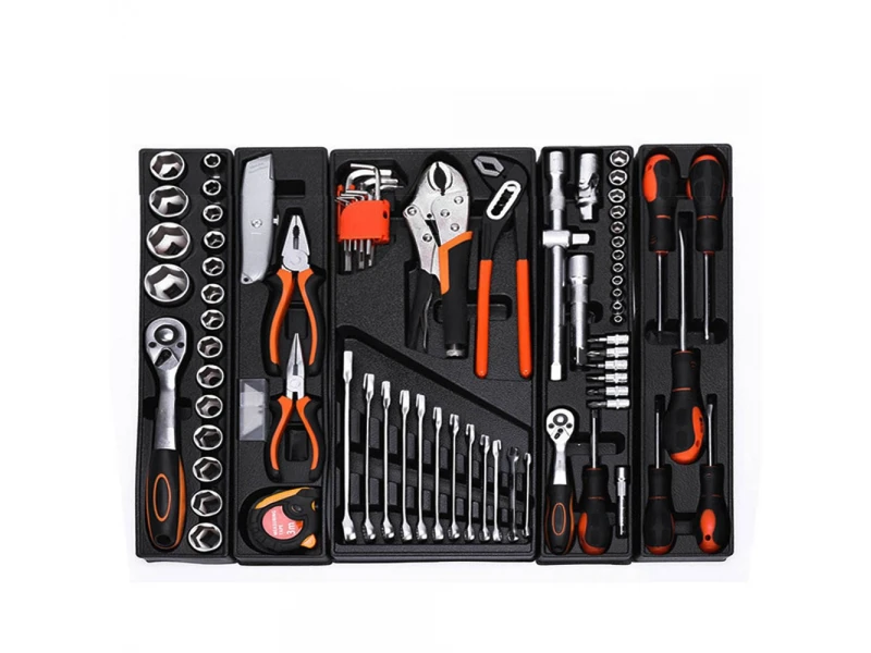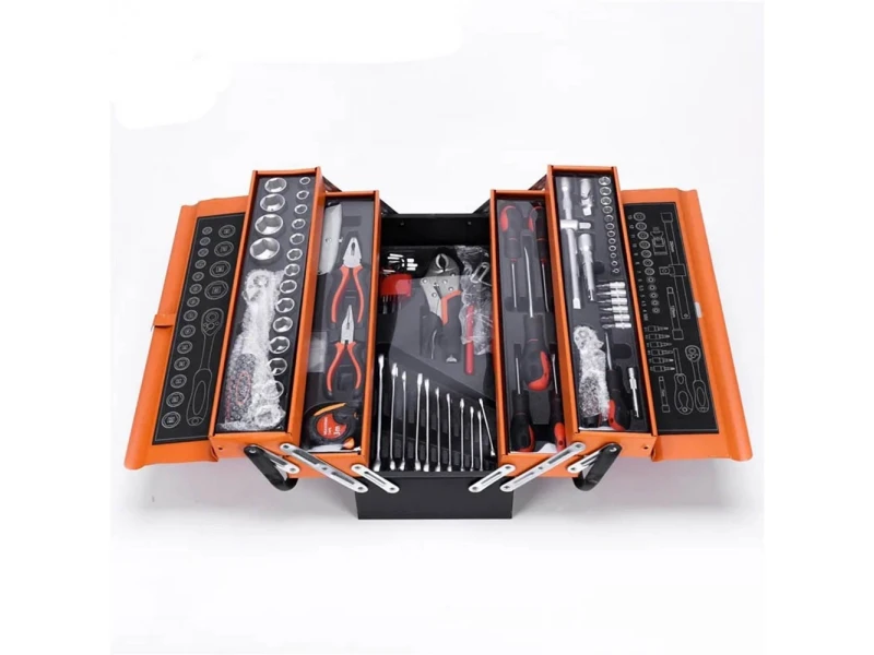 Здрава метална кутия , която се отваря за да може инструментите и консумативите ви да бъдат винаги под ръка.КОМПЛЕКТЪТ ВКЛЮЧВА:18 x Вложки за гаечен ключ (1/2″) 10, 11, 12, 13, 14, 15, 16, 17, 18, 19, 20, 21, 22, 23, 24, 27, 30, 32 мм1 x Бързо освобождаване дръжка с тресчотка (1/2″)1 x 5″ удължител (1/2″)1 x 10″ удължител с 3-посочен адаптер (1/2″)1 x Съединител (1/2″)12 x Гнезда (1/4″): 4, 4.5, 5, 5.5, 6, 7, 8, 9, 10, 11, 12, 13 мм1 x Дръжка с тресчотка за бързо освобождаване (1/4″)1 x 3″ удължител (1/4″)Гнезда за битове за отвертка от 6 части1 x Отвертка с гнездо1 x Иглени клещи 6″1 x Комбинирани клещи 7″1 х Ролетка 3 м1 x Нож за рязане10 x Резервни остриета5 x Отвертки: 5 x 75, 6 x 100, 8 x 150 мм, PH1 x 75 мм, PH2 x 100 мм1 x Клещи за водна помпа 10″1 x Клещи за захващане 10″9 x Шестограмен ключ 1,5-10 мм12 x Отворени гаечни ключове – 6, 8, 9, 10, 11, 12, 13, 14, 15, 16, 17, 19 мм1x Метален куфар
