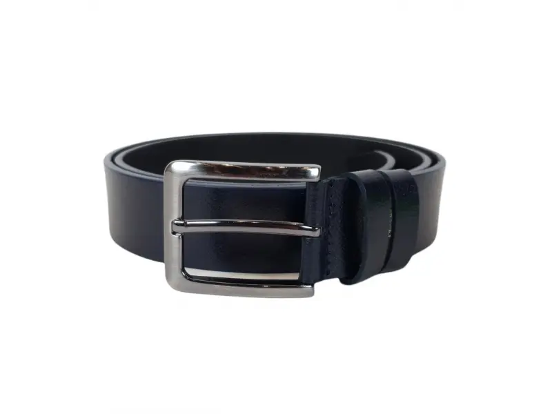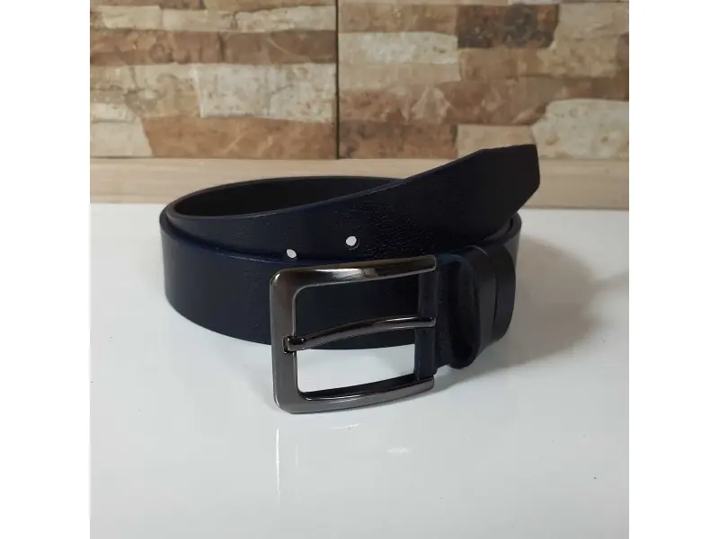 Мъжки колан за панталони и дънкиМъжки колан от качествена естествена телешка кожа. Син колан с метална тока, подходящ за дънки и панталони с възможност за лесно скъсаване.