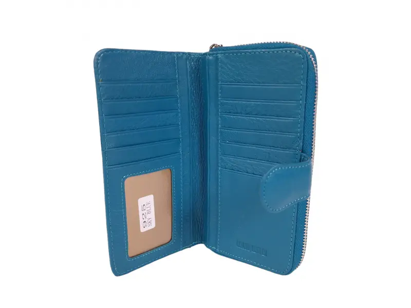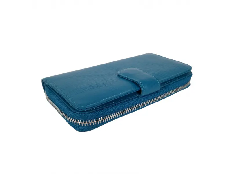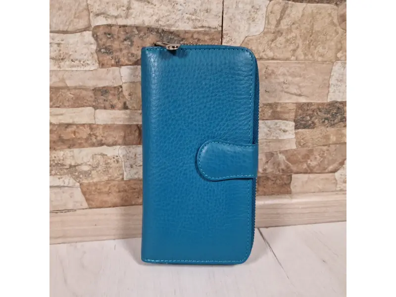 Синьо голямо портмоне с много слотове за карти - Дамско портмоне от естествена кожа. - Закопчаване с цип и копче тик-так. - Много отделения за карти. - Отделения за банкноти. - Вътрешен монетник с цип.