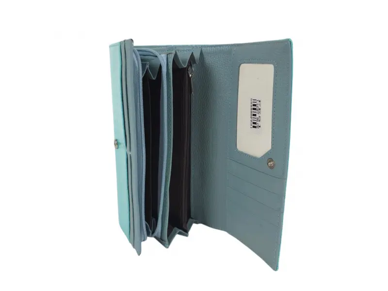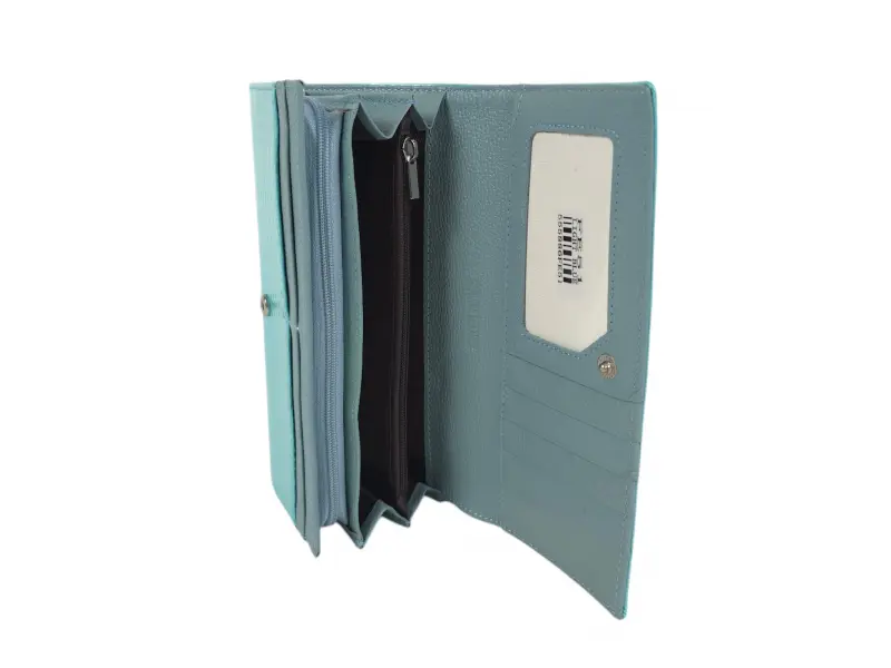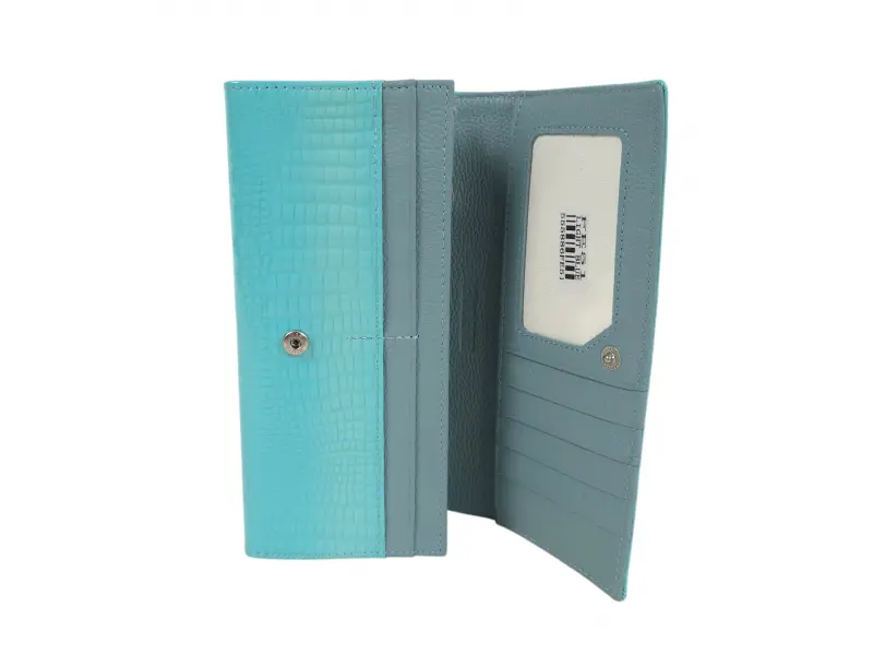 Синьо дамско портмоне от естествена кожа и лак. Голямо дамско портмоне с отделения за банкноти, слотове за карти и лични документи и монетник с цип. Красиво дамско портмоне с интересен дизайн.