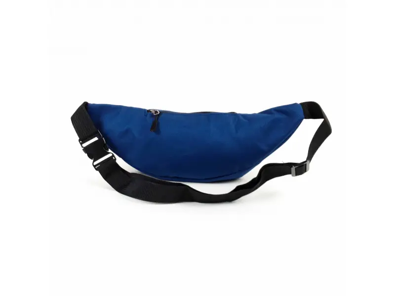 Синя чанта за през кръста от плат. Унисекс чанта с едно основно отделение с цип, преден и заден джоб с цип и регулиращ се колан от полиестер.