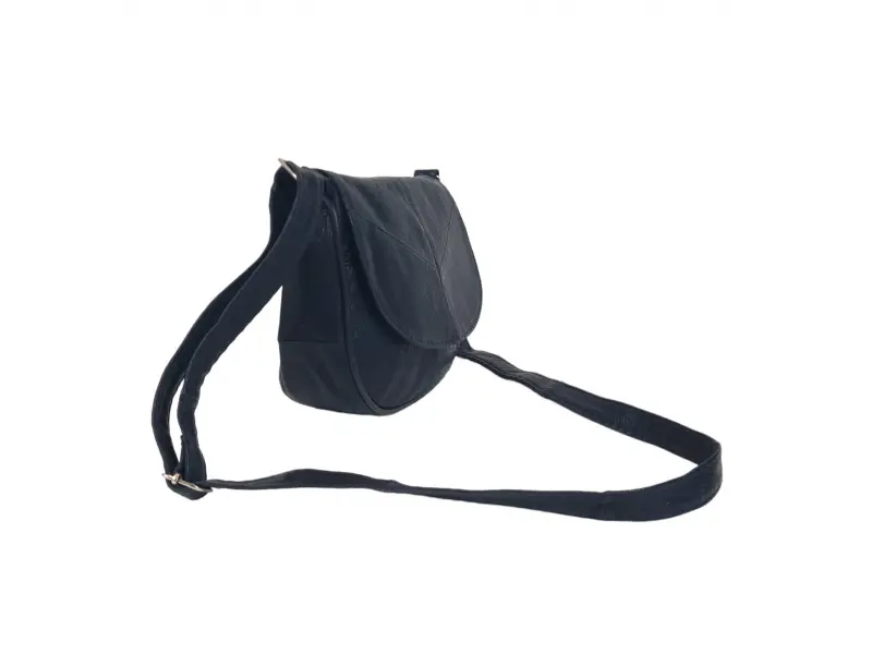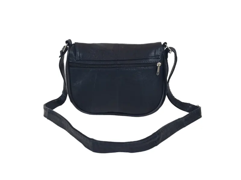 Малка синя дамска чанта с капак - Дамска чанта от естествена кожа. - Едно основно отделение с цип и капак с магнитно закопчаване. - Малко вътрешно джобче с цип. - Преден джоб под капака с цип. - Заден джоб с цип. - Регулираща се се дълга дръжка.