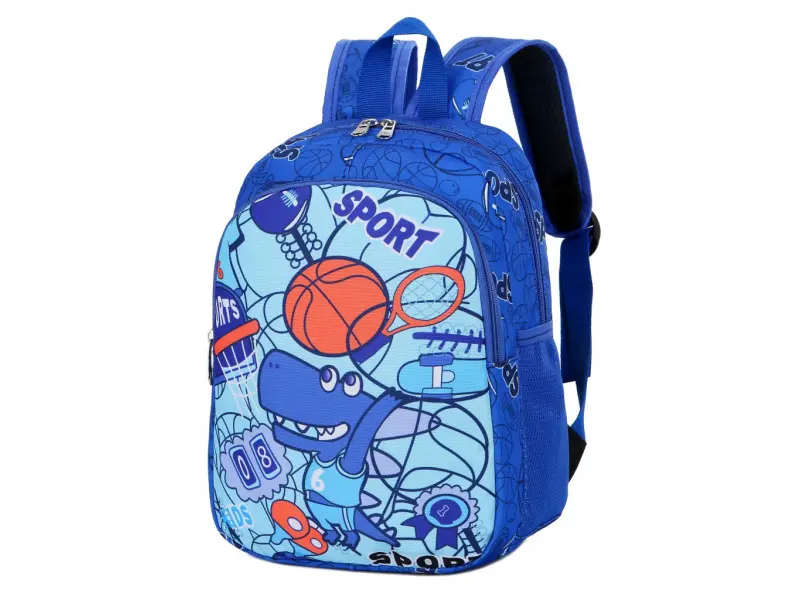 Детска раница подходяща за момче с динозавър. Раница с едно голямо отделение с цип, малка преграда, преден джоб с цип, две места за бутилки, дръжка за носене и регулиращи се презрамки.
