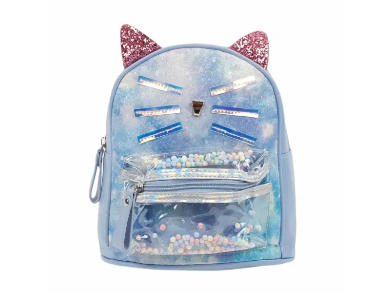 Удобна детска раница в син цвят - коте. Детска раница с едно голямо отделение затварящо се с цип, малко вътрешно джобче и преден джоб с цип. Раница с регулиращи се презрамки и дръжка за носене.