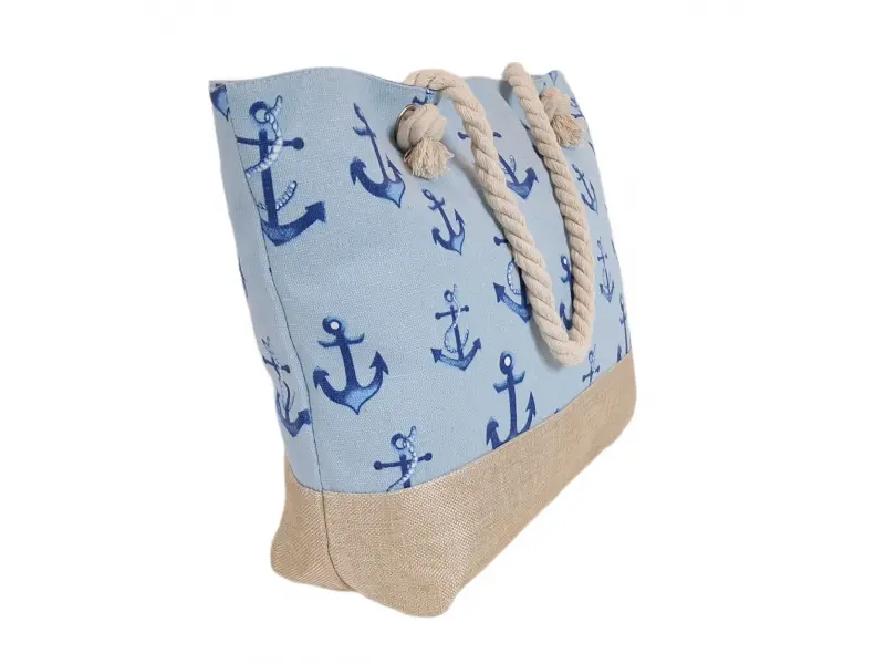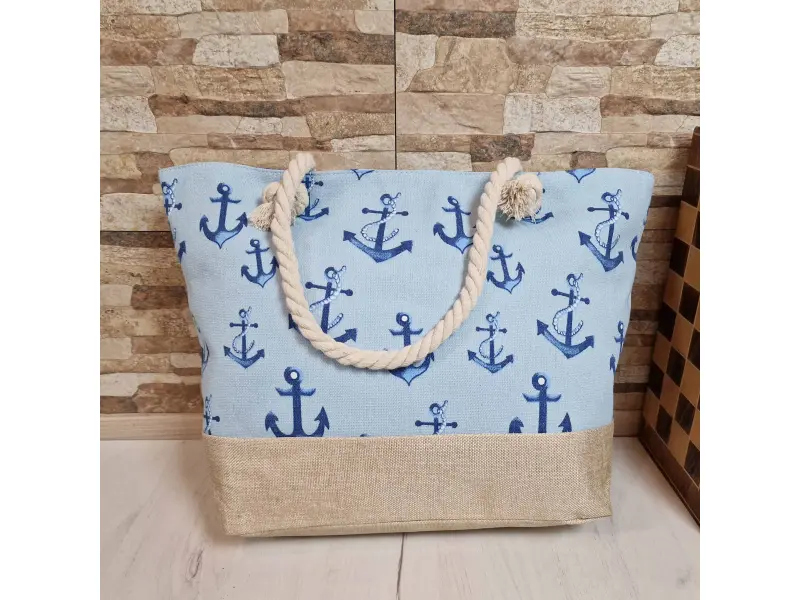 Синя плажна чанта от качествен плат с котвички с едно отделение с цип и удобни въжени дръжки.
