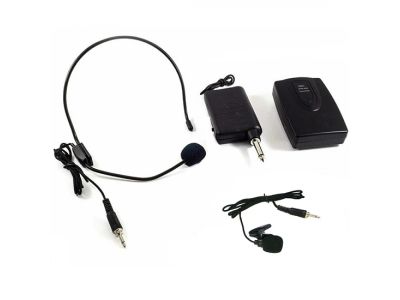 Тип: Вокален, динамиченРежим модулация: FM Честотен прием, лента: 45Hz-16KHzКомпенсация на изкривяването: <0.5%Обхват на микрофоните: 5мИзходно ниво: 500 mv или 900mvЗахранване на предавателя: Батерия 1хААЗахранване на приемника: Батерия 1х9VМарка, модел: Wvngr. WG-2011- Безжична система от 1 бр. приемник и 1 бр. предавател на сигнала- В комплекта са включени батерии, 9VDC и 1.5VDC AAМоже да се използва един микрофон в работен режим, само брошката или само диадемата.Немогат да се използват брошката и диадемата едновременно