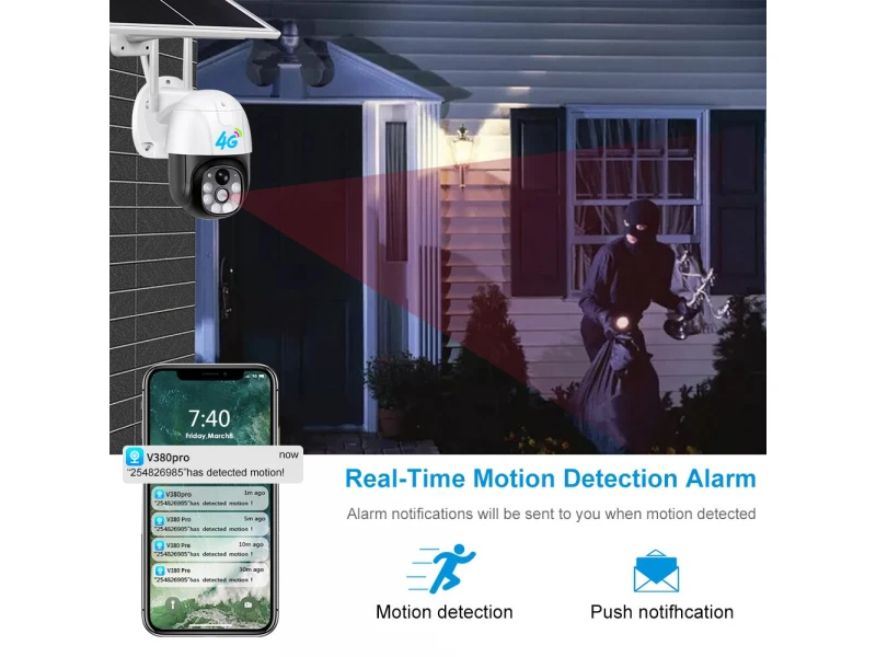 Професионална соларна камера за видео наблюдение, захранваща се директно от слънчевата светлина чрез соларен панел с вградени батерии. Камерата е подходяща за открити пространства където достъпът до електричество е ограничено, а окабеляването нежелано и излишно.Предимства и характеристики:Камерата работи със сим карта от мобилен оператор или WIFI .3 мегапикселова камера с резолюция 1536х2048 осигурява професионално и постоянно качество на изображенията.Въртене на камерата (PTZ) в хоризонтална и вертикална посока директно чрез мобилно приложение V380 Pro.Дистанционно наблюдение на охраняемия обект през мобилен телефон, таблет. WIFI обхват на камерата до рутера - 25 метра (открит терен).Стабилен корпус, прахо и влагоустойчива, което я прави подходяща и напълно удачна за външен монтаж и неблагоприятни атмосферни условя.Работи с безплатно приложение V380 Pro, което може да бъде изтеглено от Google Play или Apple StoreНаличен слот за SD карта с максимален капацитет 128 GB – дава възможност за запис на видео файлове и преглеждането им по всяко време през мобилното ви устройство.Интерком функция- чрез вграден микрофон и говорител се осъществява двустранна аудио връзка между камерата и наблюдателя. Може да чувате звуци от камерата, както и да говорите през телефона си и да се чува от нея.Соларен, монокристален, панел 7W със презареждащи и сменяеми 4 броя батерии 2600 mAh, модел 18650. Общ капацитет 10400mAh. Панелът е подвижен и дава възможност за максимално и оптимално позициониране спрямо слънчевата светлина. Размери на панела: 24х17см.Отлично нощно виждане с обхват до 20 метра и възможност за превключване на изображението в цветен или черно-бял режим.Известие със снимка (notification) през мобилното приложение при наличие на движение в обсега на камерата.Принцип на работа: В покой (когато няма движение) камерата има ниска консумация и по този начин запазва батериите. При наличие на движение автоматично се „събужда“ и започва видеозапис на картата памет. В този момент тя ще ви сигнализира на мобилното ви устройство през приложението. След като обекта премине от обсега й, камерата отново ще премине в „режим на изчакване“ (sleep). Друга възможна опция е да наблюдавате охраняемия обект в реално време като активирате камерата през мобилното си приложение. Тогава тя ще работи до момента, в който не излезете от приложението. Колкото по-интензивно движение има пред нея и колкото повече се наблюдава от телефона, толкова по-голяма е консумацията на батериите. Период в дни на готовност в режим на покой (sleep) без зареждане от солара – 180 дена.Настройки и функции от приложението:Информация за състояние на камерата sleep (режим на изчакване), online.Състояниет на батерията %, индикация за свободно място в картата памет.Опция за гледане в UHD (високо качество) и SD (ниско качество).Playback - Преглеждане на видео записите директно от телефона.Lighting - Опция за смяна на цветно (White light) или чернобяло (infrared) нощно виждане.PTZ - Промяна позицията на камерата хоризонтало 270, вертикално 90 градуса.Rotation speed - Настройка на скоростта на движението на камерата.Време на „заспиване“ на камерата в режим sleep.Record quality - Избор на качество на записваните видео файлове.Hover detection time –време на запис при събитие.Alarm Push – изпращане на известие на телефона при наличието на събитие. При отваряне на известието ви показва снимка от него.Human detection 