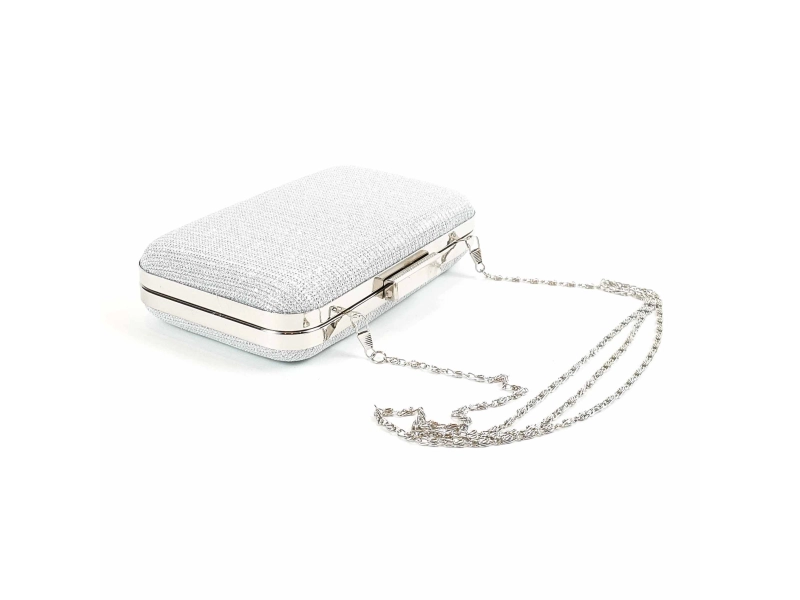 Стилна малка сребърна чанта със сребърен кант и верижка, едно отделение отварящо се с механизъм. Малка сребърна чанта подходяща за официална чанта, за сватби, вечерна чанта или бална чанта.