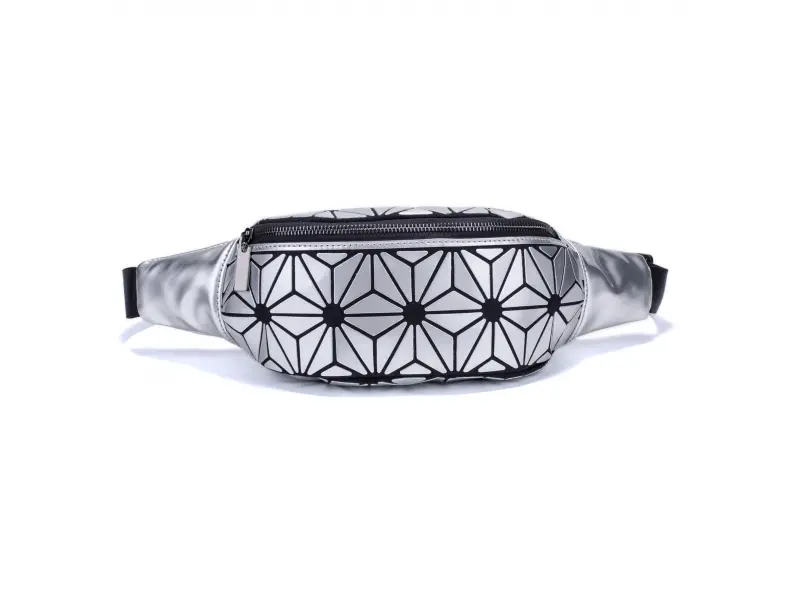 Дамска чанта за през кръста в сребърен цвят. Интересна чанта за през кръста с едно отделение затварящо се с цип, вътрешно малко джобче с цип и регулиращ се колан от полиестер.