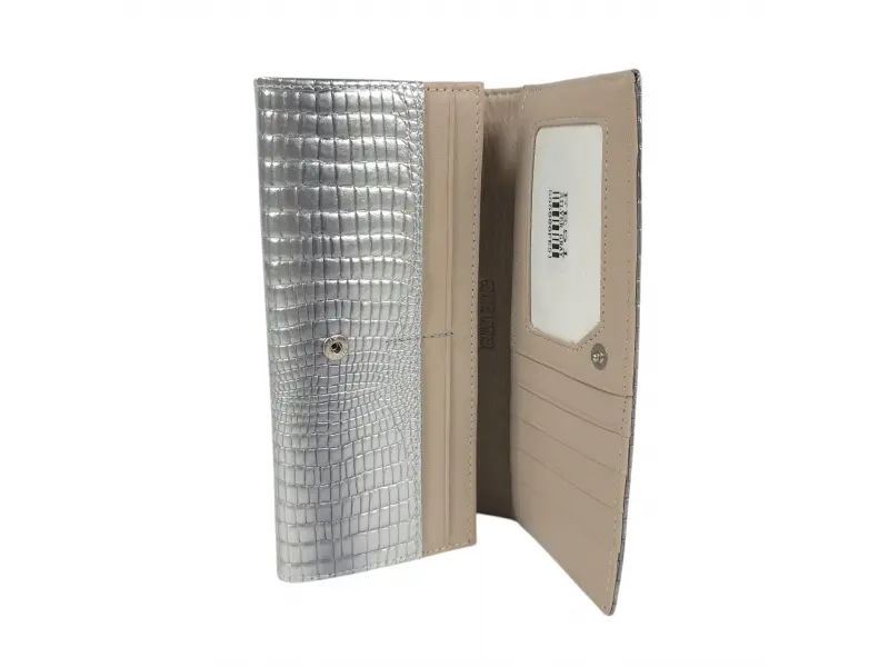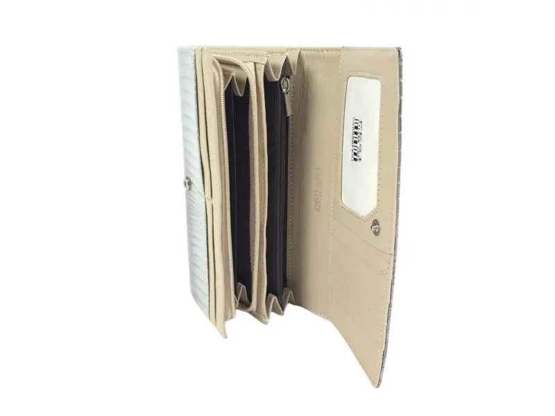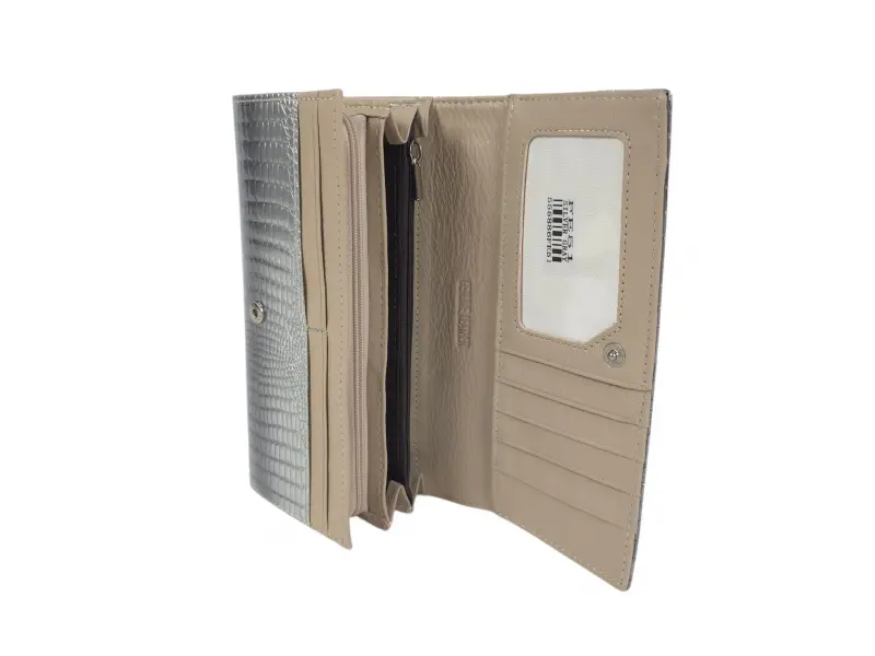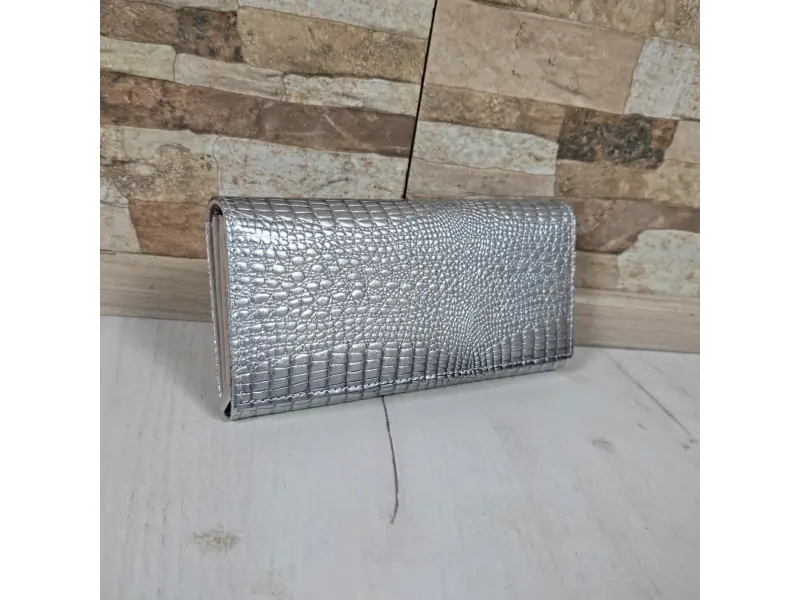 Сребърно дамско портмоне от естествена кожа и лак. Голямо дамско портмоне с отделения за банкноти, слотове за карти и лични документи и монетник с цип. Красиво дамско портмоне с интересен дизайн.