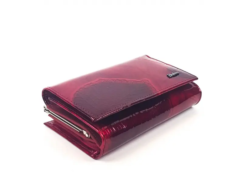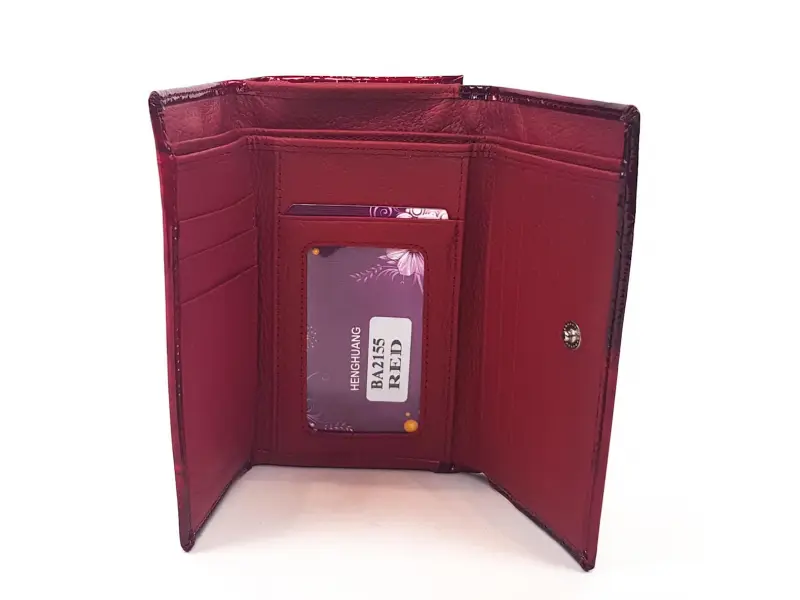 Дамско червено портмоне от естествена кожа и лак. Среден размер портмоне с външна щипка и външно отделение с цип за монети. Прекрасен модел дамско портмоне със слотове за карти и визитки , място за банкноти и две кожени прегради за банкноти. Разположението на листото може да бъде различно.