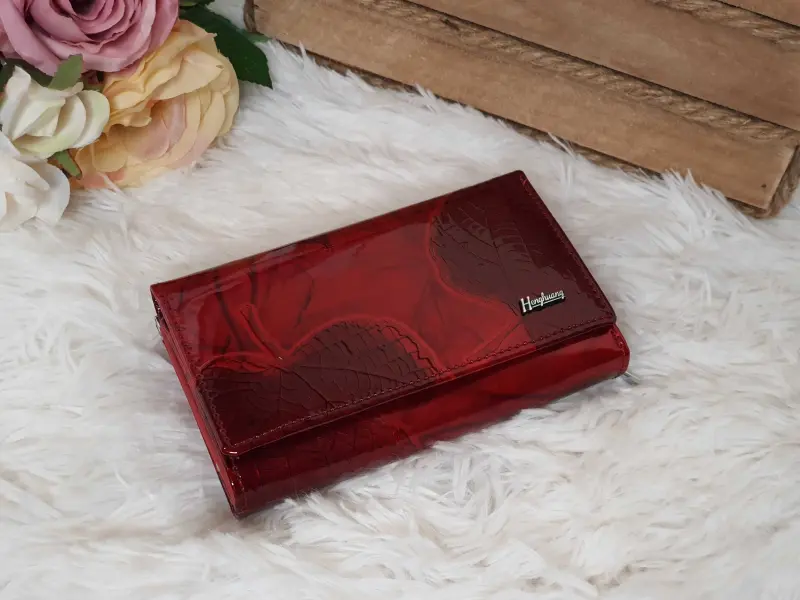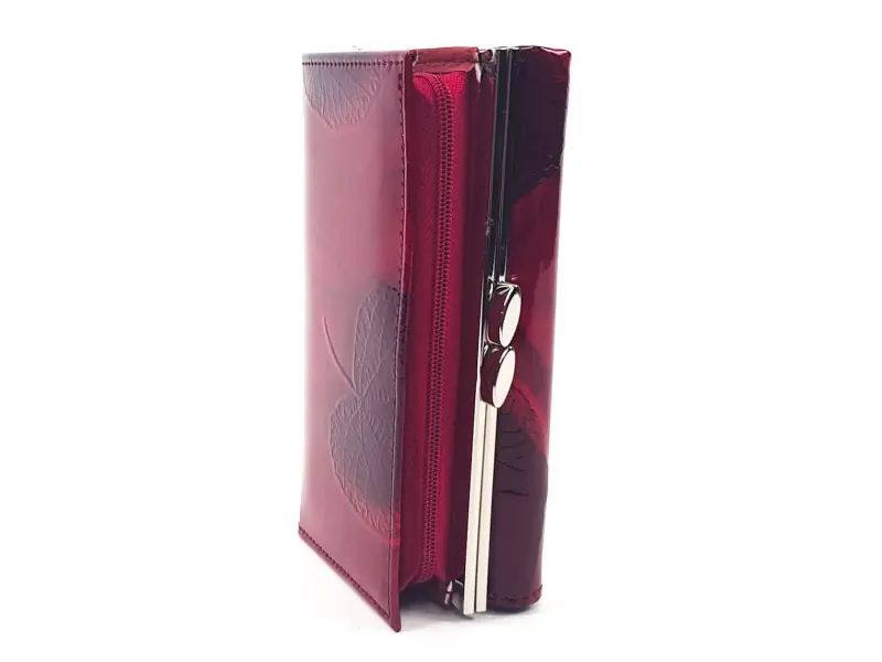 Средно лакирано портмоне - листо. Интересно дамско портмоне от естествена кожа и лак. Средно портмоне с гравирани листа в червен цвят от онлайн магазин ePazar.bg