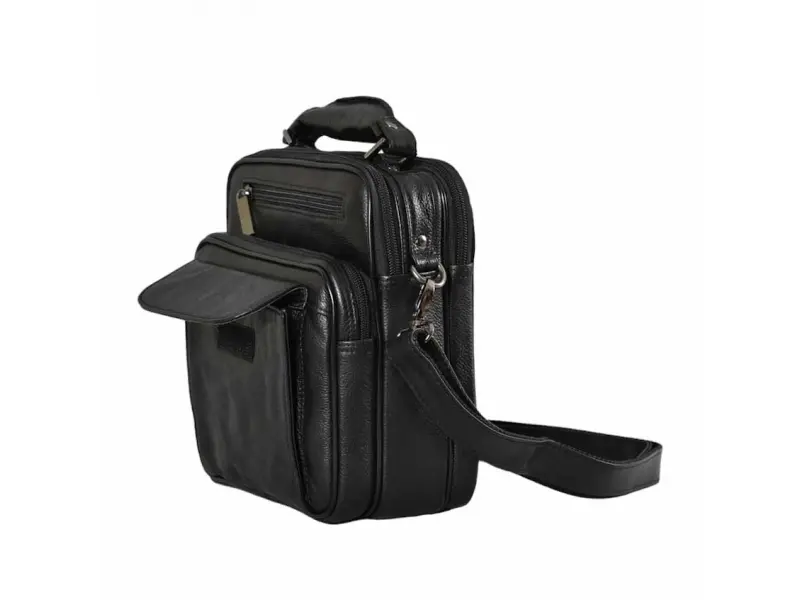 Мъжка чанта с много отделения - Две основни отделения с цип. - Малък вътрешен джоб с цип. - Два предни джоба с цип. - Преден джоб с капак. - Заден джоб с цип. - Регулираща се презрамка. - Дръжка за носене в ръка.