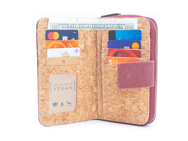 Качествено дамско портмоне от екологична материя - корк. Удобно дамско портмоне със закопчалка и външен монетник затварящ се с цип, преграда за монети и малък монетник с цип, много слотове за карти и документи и отделение за банкноти.