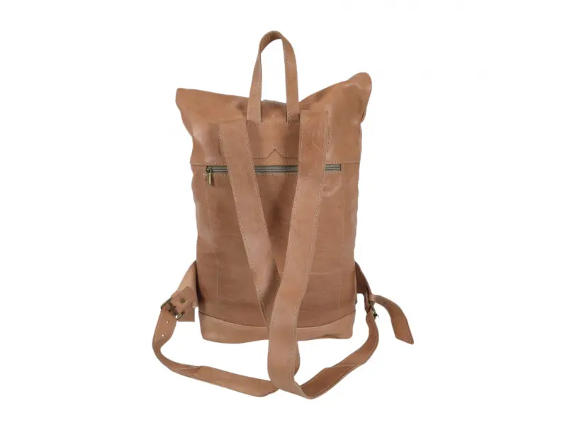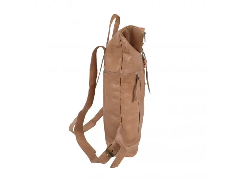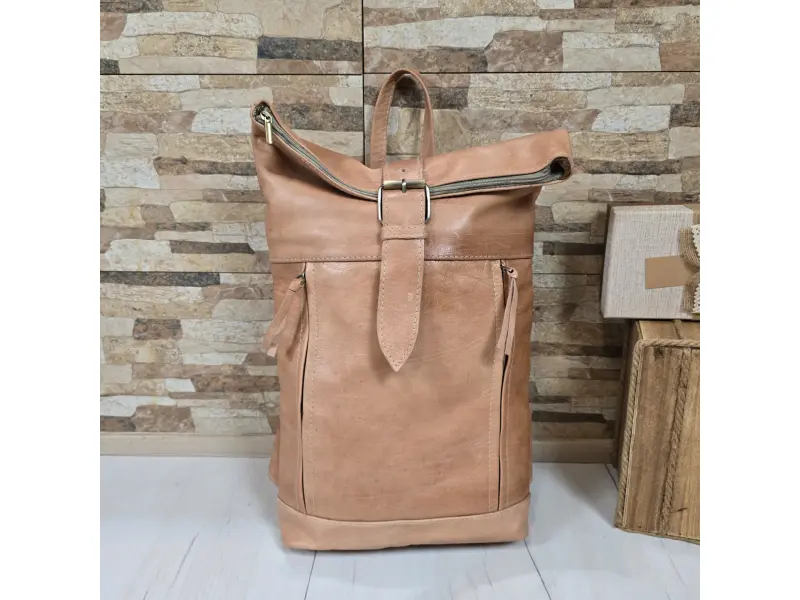 Голяма раница в натурален цвят от естествена кожа - Раница от качествена естествена кожа. - Едно основно отделение затварящо се с цип и кожен колан. - Вътрешен джоб с цип. - Два предни джоба с цип. - Заден джоб с цип. - Дръжка за носене в ръка. - Регулиращи се презрамки.