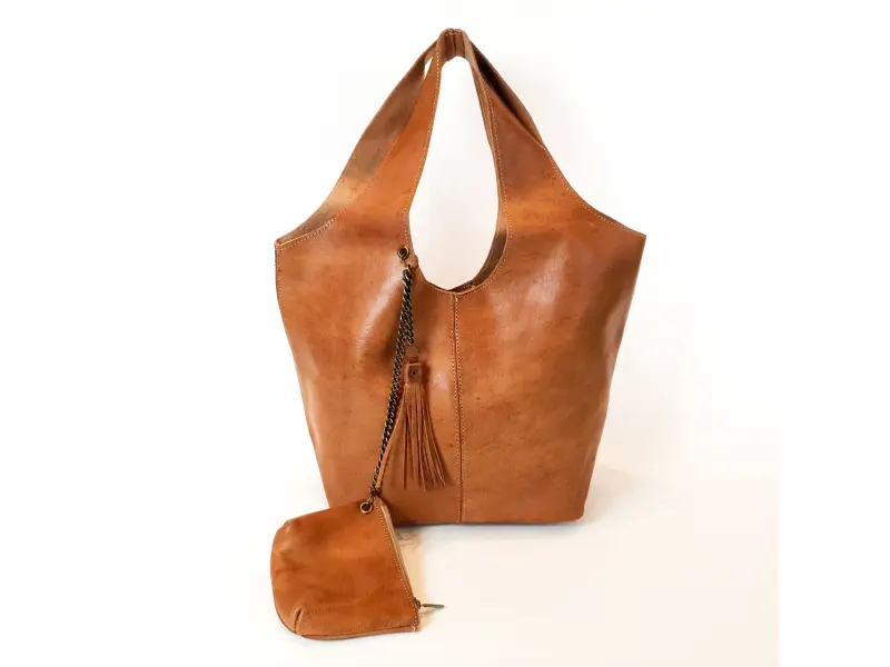 Голяма дамска чанта тип торба от естествена кожа, ръчно обработена. Мароканска чанта - торба с магнитно закопчаване, със здрави дръжки и допълнително портмоне с цип.
