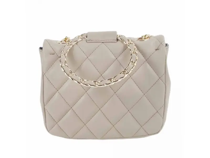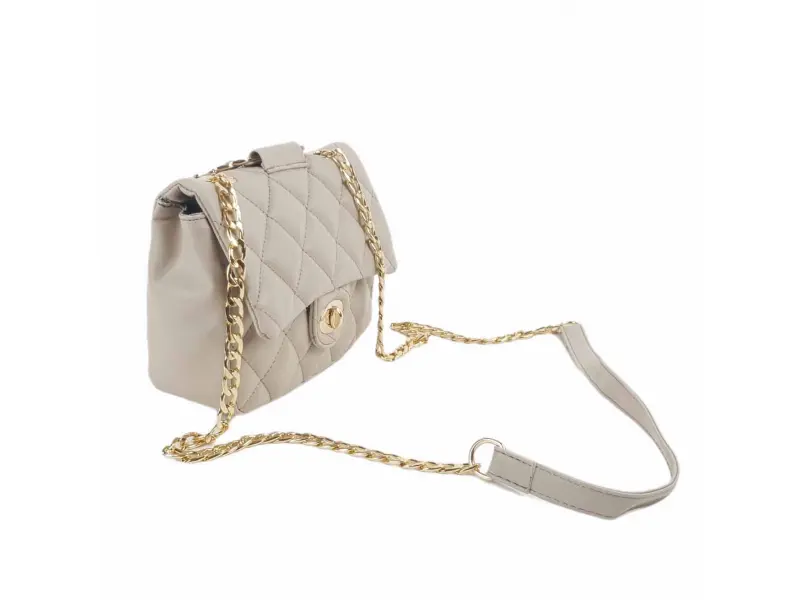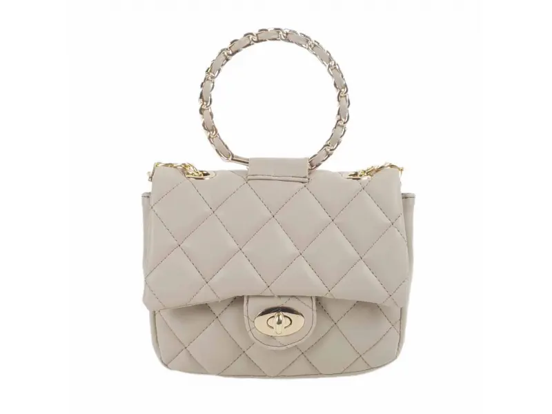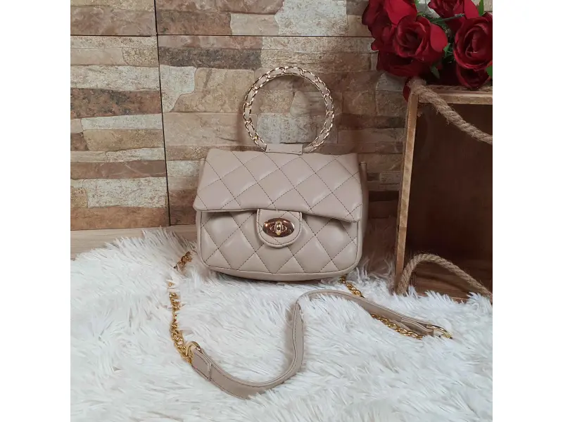 Малка дамска чанта от качествена еко кожа в бежов цвят. Удобна дамска чанта с едно отделение, малко вътрешно джобче без цип, интересна дръжка за ръката и дълга дръжка тип верижка в съчетание с еко кожа за удобство на рамото.