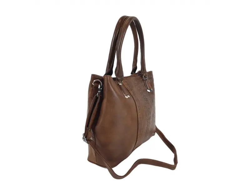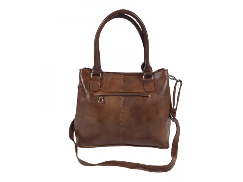 Удобна дамска чанта в кафяв цвят - Дамска чанта от естествена кожа. - Две основни отделения с цип. - Малко вътрешно джобче с цип. - Отделение за телефон или ключове. - Заден джоб с цип. - Дълга регулираща се дръжка.