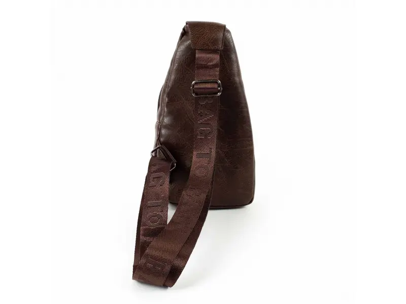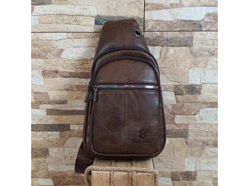 Мъжка чанта за през гърди от качествена изкуствена кожа. Тъмно кафява мъжка чанта, която може да се носи през гърди, рамо или гръб тип раница. Мъжка чанта с две отделения с цип и малък преден джоб в цип.