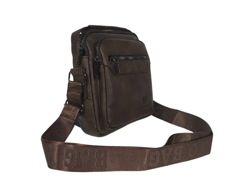 Здрава мъжка чанта от качествена еко кожа. Стилна чанта с много отделения и здрави ципове. Тъмно кафява мъжка чанта с дълга регулираща се дръжка и удобна дръжка за носене в ръка.