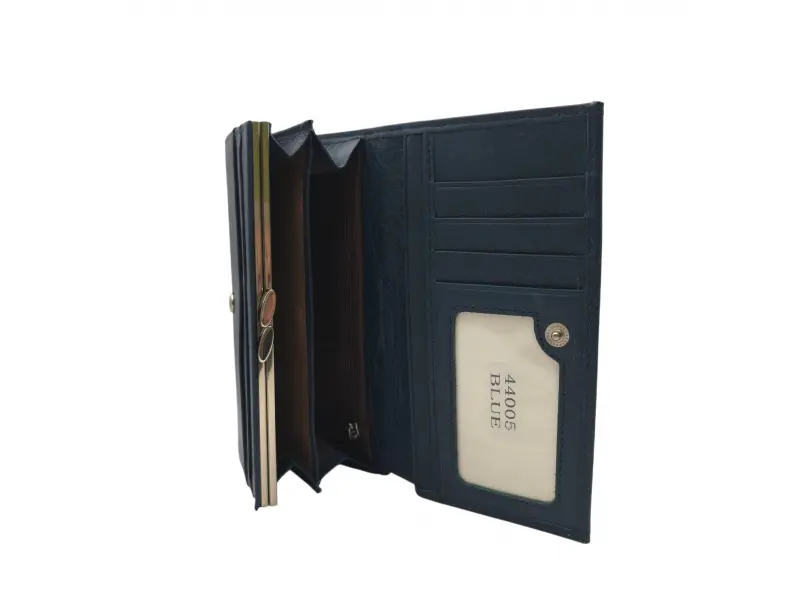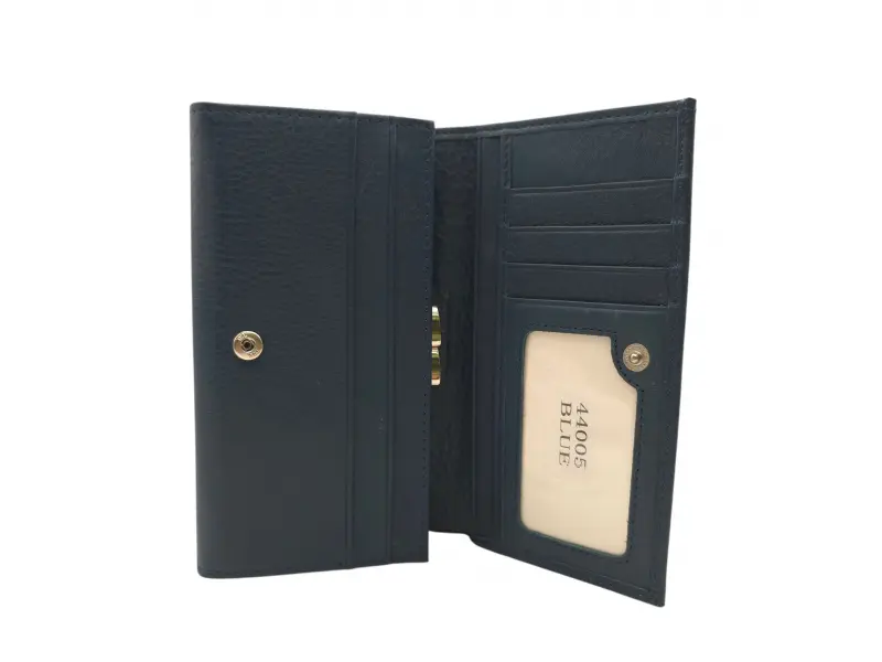Тъмно синьо дамско портмоне от висококачествена ествествена кожа. Дамско портмоне с удобни отделения за банкноти, монетник с щипка и слотове за карти и лични документи.