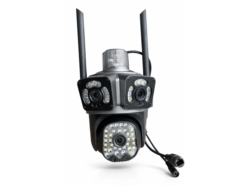 Тройната външна WiFi камера 12MP с три обектива и ICSee е иновативно решение за сигурността на вашия дом, офис, склад или търговски обект. Съчетавайки три висококачествени обектива и троен екран, тази камера осигурява пълно покритие на зоната за наблюдение и ясна картина с висока детайлност. Идеална е за всеки, който търси надежден контрол и спокойствие, независимо дали се намира на място или наблюдава от разстояние чрез мобилното приложение.
