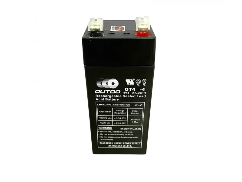 Акумулаторите са от серията VRLA - оловно-киселинни капсуловани необслужваеми тягови акумулатори. Те са изработени по AGM технология, гарантираща производителност и мощност при съотношение на капацитет и тегло. AGM акумулаторите намират приложение във фенери, аварийно осветление и други.Акумулаторна батерия за кантар, везна, 4V 4Ah подходящ за: Вертикално или хоризонтално поставяне и захранване на кантари, везни за плодове и зеленчуци, хранителни стоки Марка: OUTDOКапацитет: 4 [Ah]Номинално напрежение: 4 [VDC]Размери: ДхШхВ: 47x47x100 ммВътрешно съпротивление: 18 [mohm]Модел: OT4-4Тип акумулатор: тяговВид акумулатори: оловно-киселинен2 бр. изводи тип кабелна обувка, 6.3 мм широки ( + и - )