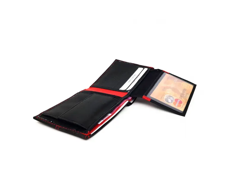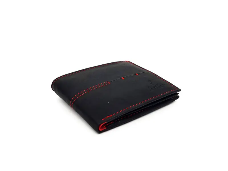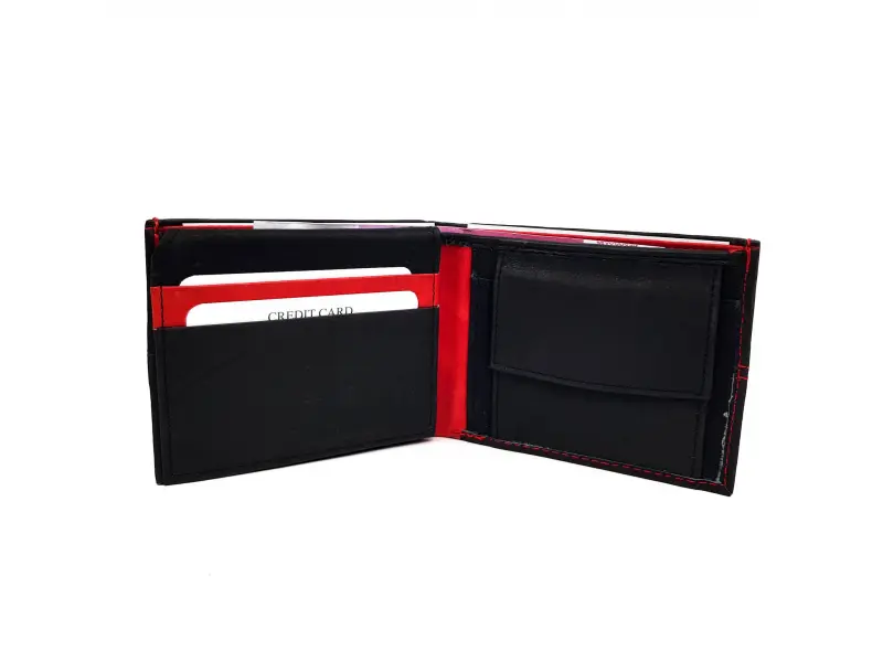 Качествен мъжки портфейл от естествена кожа. Удобно разпределение за визитни , банкови карти и документи , място за монети. Стилен портфейл в черен цвят в съчетание с червено.