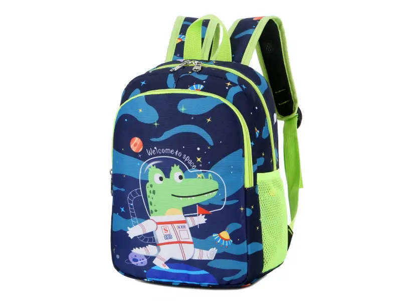 Детска раница подходяща за момче с динозавър. Раница с едно голямо отделение с цип, малка преграда, преден джоб с цип, две места за бутилки, дръжка за носене и регулиращи се презрамки.