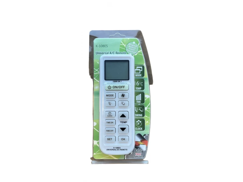 Универсално дистанционно управление за климатик с 108 кода и таймер. Дистанционното управление е подходящо за следните марки климатици: Acson, Adc, Aidelong, Aite, Akira,Amcor,Amico, alpin, Aucma, Aux, Aoke, Aoli, Apton, Baixue,Beijingjingdian, Big-Thumb, Boerka, Boshi, Boshigao,Borler, Caixing, Carrier, Chagfeng, CHANGFU, cHANGLING, Changhong, Chengyuan, Chuanghua, Chuanyan, Chigo, Chunlan, Colrolla,Corona, Crown, Daewoo,Daikin, Dajinxing, Dake, Daotian, delonghi, Dunan,Dongxia, Dongxinbao, Elco, Electer, Electrolux, Fedders,Feiedrich, Feige, Feilu, Ferroli, first, frestech, Fujitsu, galanz, Geer, Glee, Goldstar,Gree, Guangda, Guqiao, Haier, Helton, Hemilton, Hicon,Hisense,Hitachi, Hongyi,Huabao,Huagao, Huake, Huamei, Huanghe, Hualing, Huawei, Huifeng,Hyundai, Inycin,Jiangnan, Jiale, Jimstar, Jinbeijink, Jinda, Jinsong, Johnso, Kangli, Kelong, Klimatair,Konka, Kris, Kt02_D001, Kt02_D002, Kty001,Kty002,Kty003,Kty004,Kty005, LG, Liangyu, Likeaie, Littleswan, Longhe, Loren-Sebo, Mcquay, Md, Meiling, Mingxing, Mitsubishi, Mitsuka, National, Nikko, Niso, Norka, Olympus, Opal, Panda, Pereg, Pinshang, Pilot, Puyi, Qixing, Raybo, Rhoss, Ricai, Rijiang, Rowa, Sacon, Samsung, Sanyo Nec, Sanzuan, Saporo, Sast, Sensor, Serene, Shamei, Shangling, Shanye, Shanxing, Sharp, Shenbao, Shengfeng, Shengfeng/feilu, Shinco, Shining, Shuanglu, Sigma, Sogo, Songlinxia, Songxing, Sova, Sowa, Soyea, Speed, Srtc, Staright-aircon, Sunburg, Tadiair, Tadiran, Taiya, TCL, Teac, Teco, Tianjinkongtiao, Tianyuan, Tobo, Tongli, Toyo, Toshiba, Trane, Uni-air, Uttleduck, Wanbao, Wangzi, Weili, Weiteli, Whirlpool, Wufeng, Xinghe, Xinle, Xinling, Xileng, Xiongdi, Yair, Yaoma, Yidong, York, Yutu, Zapaizuzhuangji, Zhongyi, Zuodan и др.