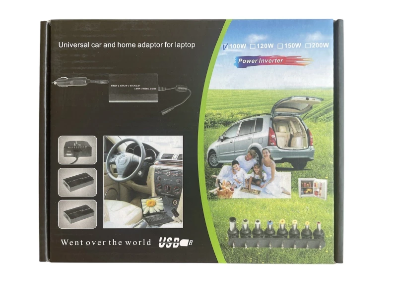 Мултифункционално зарядно 100W с USB порт, 8 сменяеми щепсела и защита срещу претоварване. Работи с 12V DC и 110–240V AC – идеално за дом и кола.