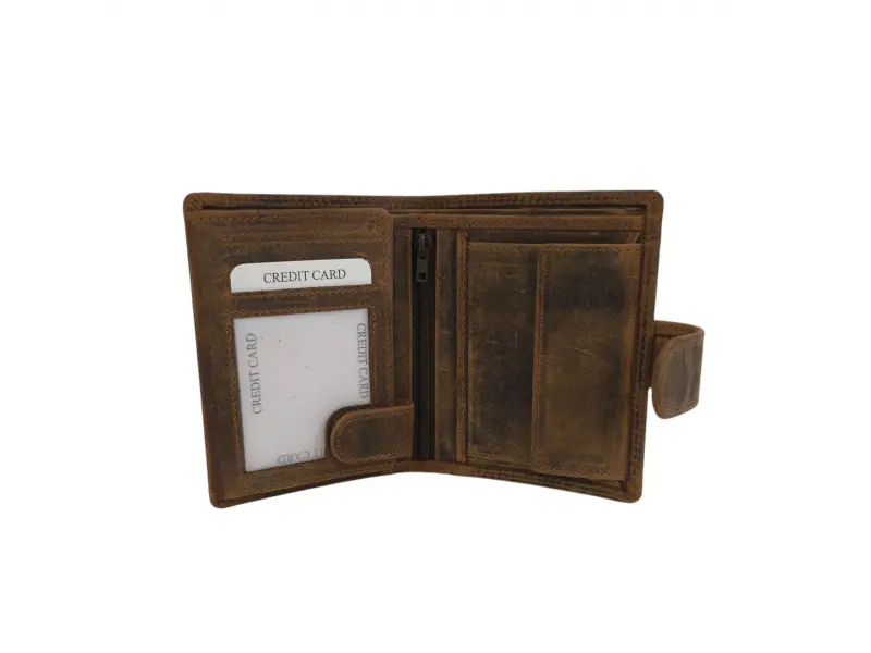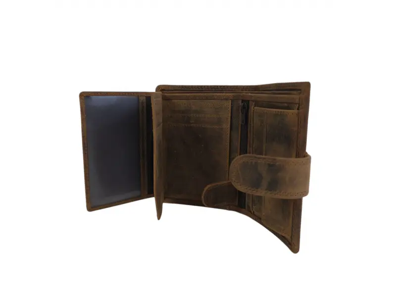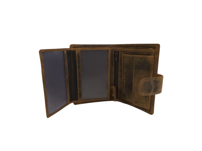Висококачествен мъжки портфейл от естествена хънтер кожа. Мъжки портфейл с удобно разпределение за банкноти, карти и лични документи и монети. Мъжки портфейл със закопчалка.