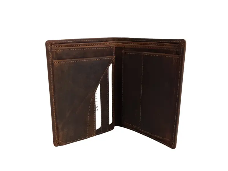 Ръчно изработен портфейл от специално обработена естествена hunter кожа. Кафяв портфейл с отделение за банкноти, слотове за карти и документи и вътрешен монетник.