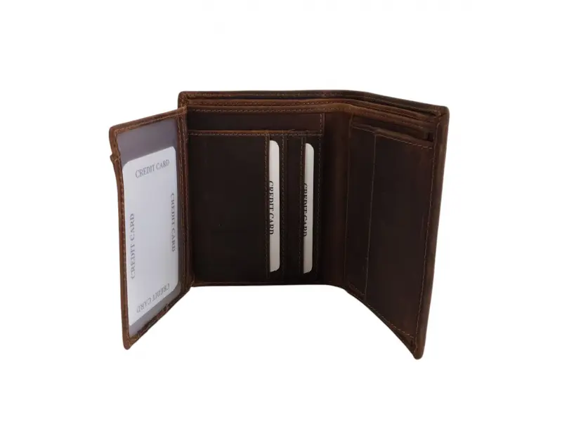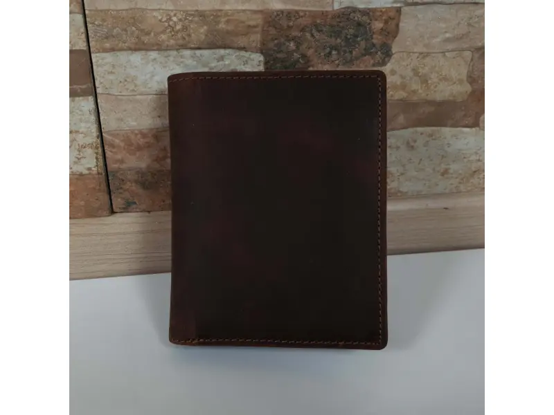 Удобен портфейл от hunter кожа Ръчно изработен портфейл от специално обработена естествена hunter кожа. Кафяв портфейл с отделение за банкноти, слотове за карти и документи и вътрешен монетник.