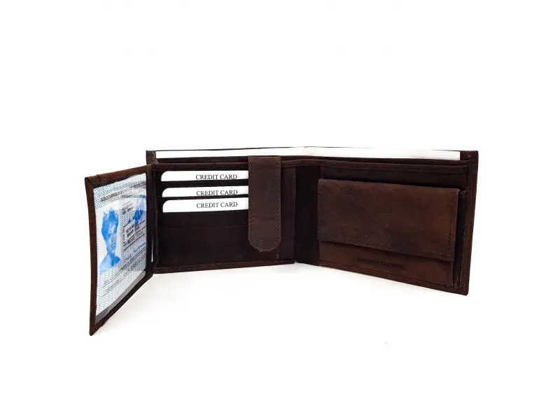 Качествен мъжки портфейл в стандартен и удобен размер с разположение за документи , банкови и визитки карти , място за монети и банкноти. Портфейл ръчна изработка високо качество.