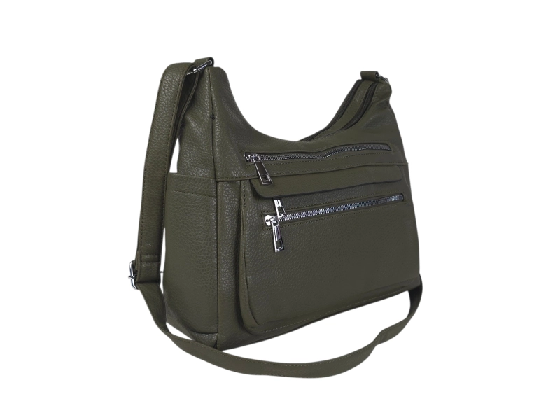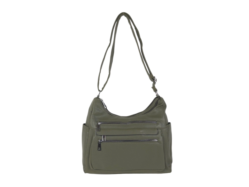 Средна дамска чанта от качествена еко кожа. Зелена дамска чанта с много отделения и регулираща се дълга дръжка. Ежедневна дамска чанта с интересен дизаин.