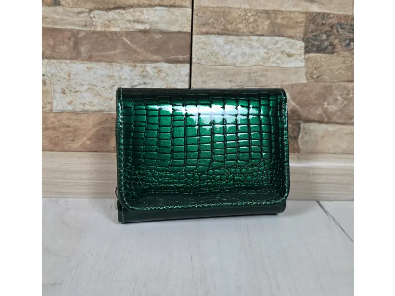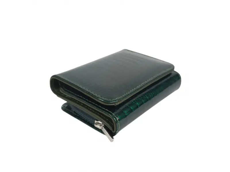 Малко лачено портмоне с лаково покритие - Зелено портмоне от естествена кожа и лак. - Затваряне с магнит. - Отделения за карти и лични документи. - Отделение за банкноти. - Монетник с цип.