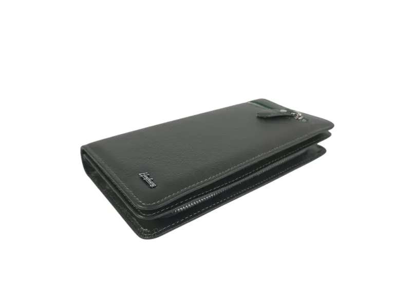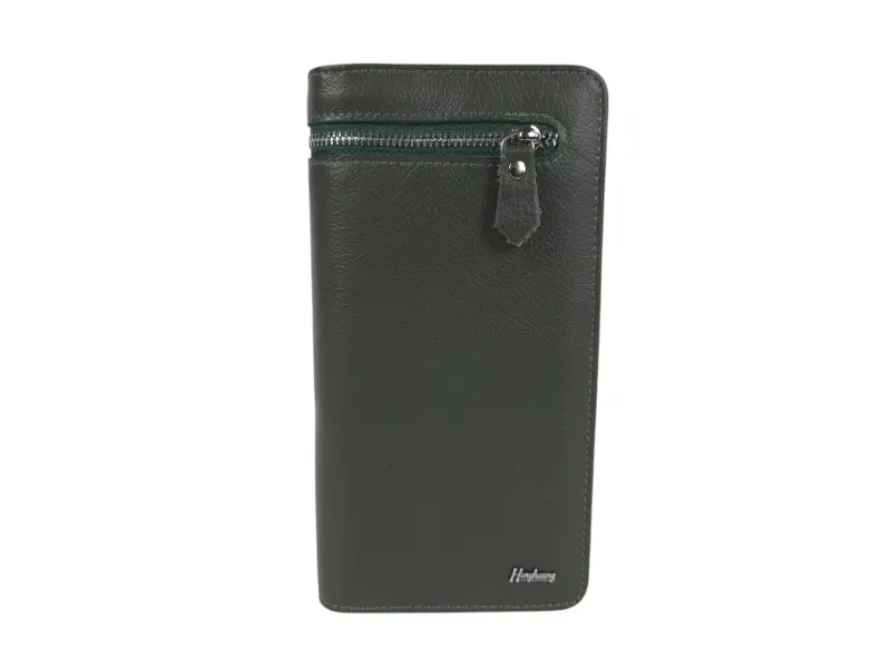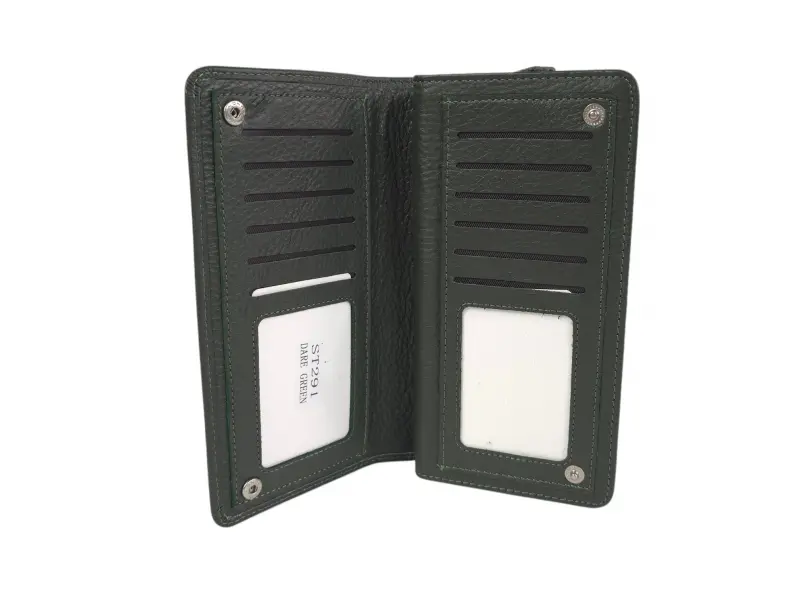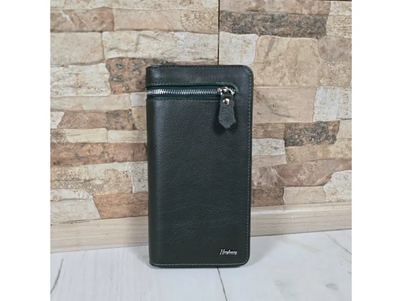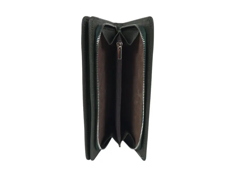 Голямо дамско портмоне от качествена естествена кожа. Вертикално дамско портмоне в зелен цвят с отделения за банкноти, слотове за карти и лични документи и монетник с цип.
